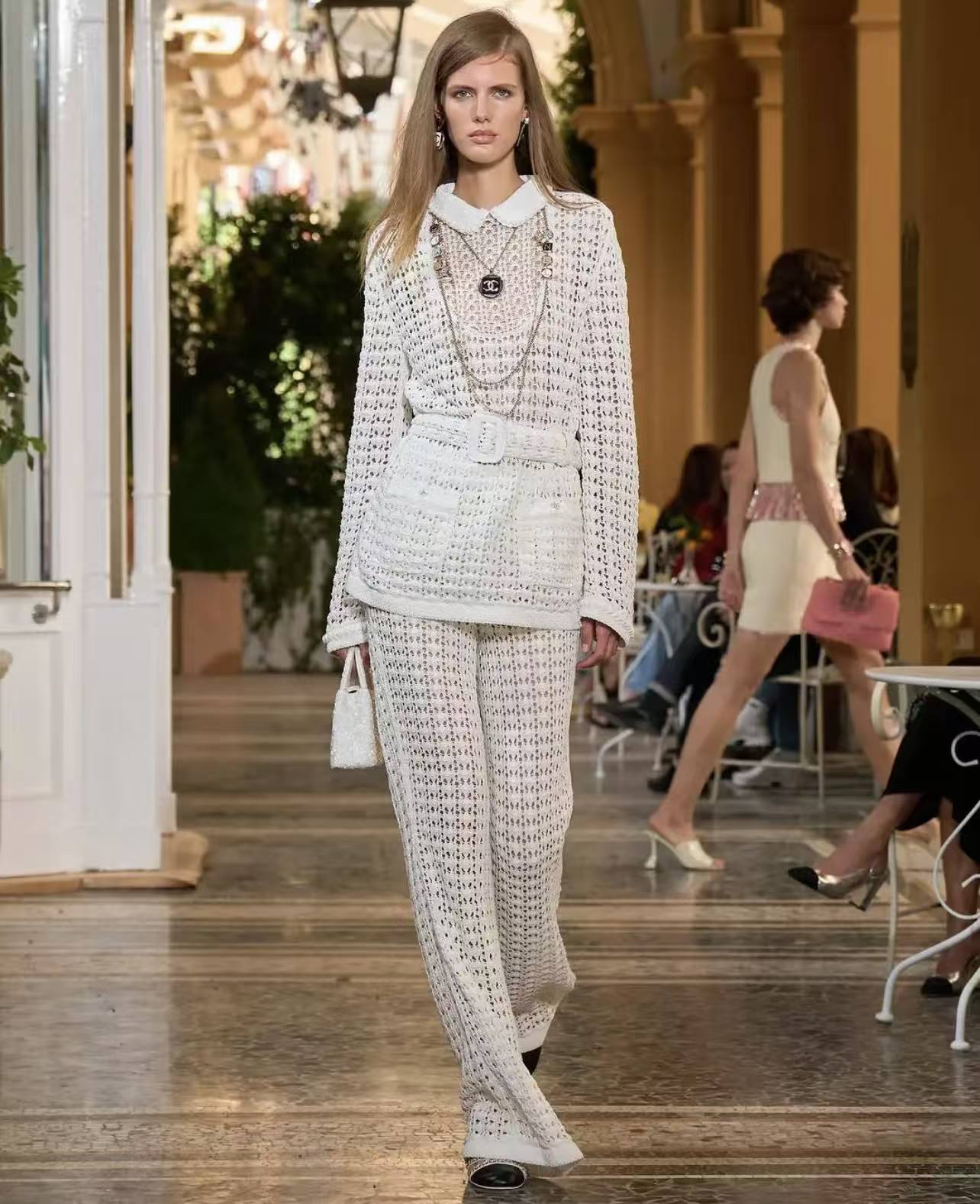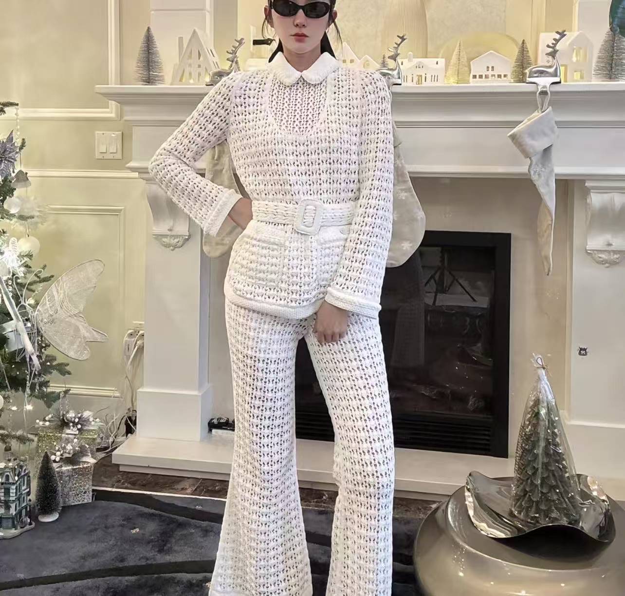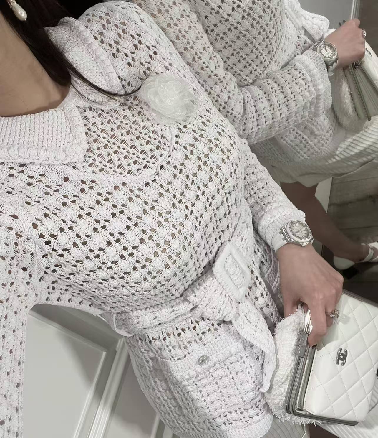 ✨ 🆕 ❤️ CH*NL 26C Advanced Handicraft Workshop Series Hollow Knitted Top 丨 ⚠ Exclusive development! Top quality products! The doll collar outlines a lively and girlish vibe, while the hollowed out crochet technique blends legal elegance. The waist belt of the same material is tied to create a graceful waistline, and the white gauze like texture shimmers in the light and shadow, creating a hazy texture. Each stitch is crafted by Gaoding Workshop, blending their classic elegance into the romance of daily life ☑️