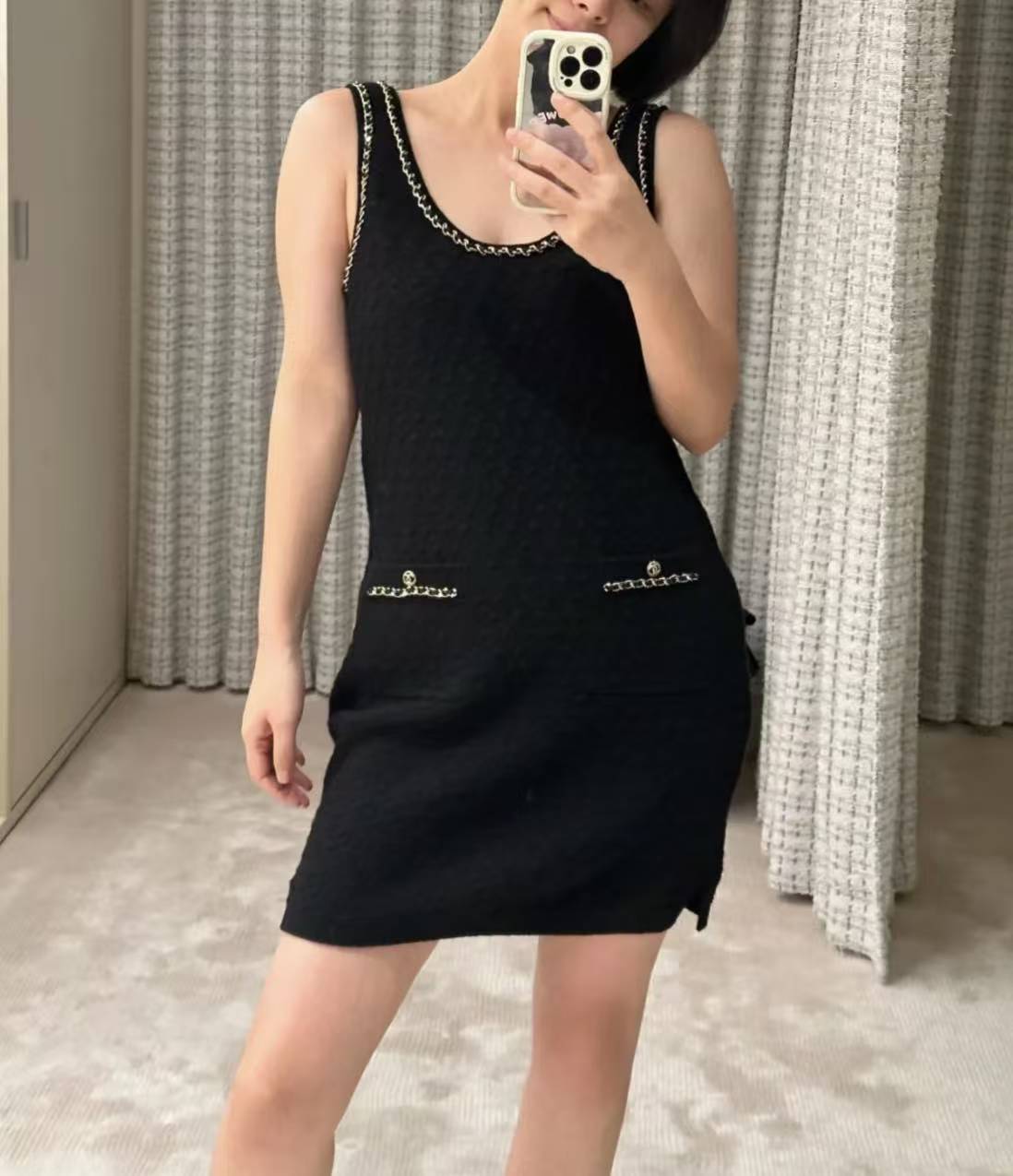 ✨ 🆕❤️ CH *AN Black gold leather chain dress, knitted material+classic black gold chain, elegant and high-end. Sleeveless vest design, round neck+hem pocket, chain embellishment details perfect! The fabric has good elasticity, slim fit and curves, making it easy to handle black versatile for daily or formal occasions, while white is fresh and looks good no matter how it is paired~☑️
