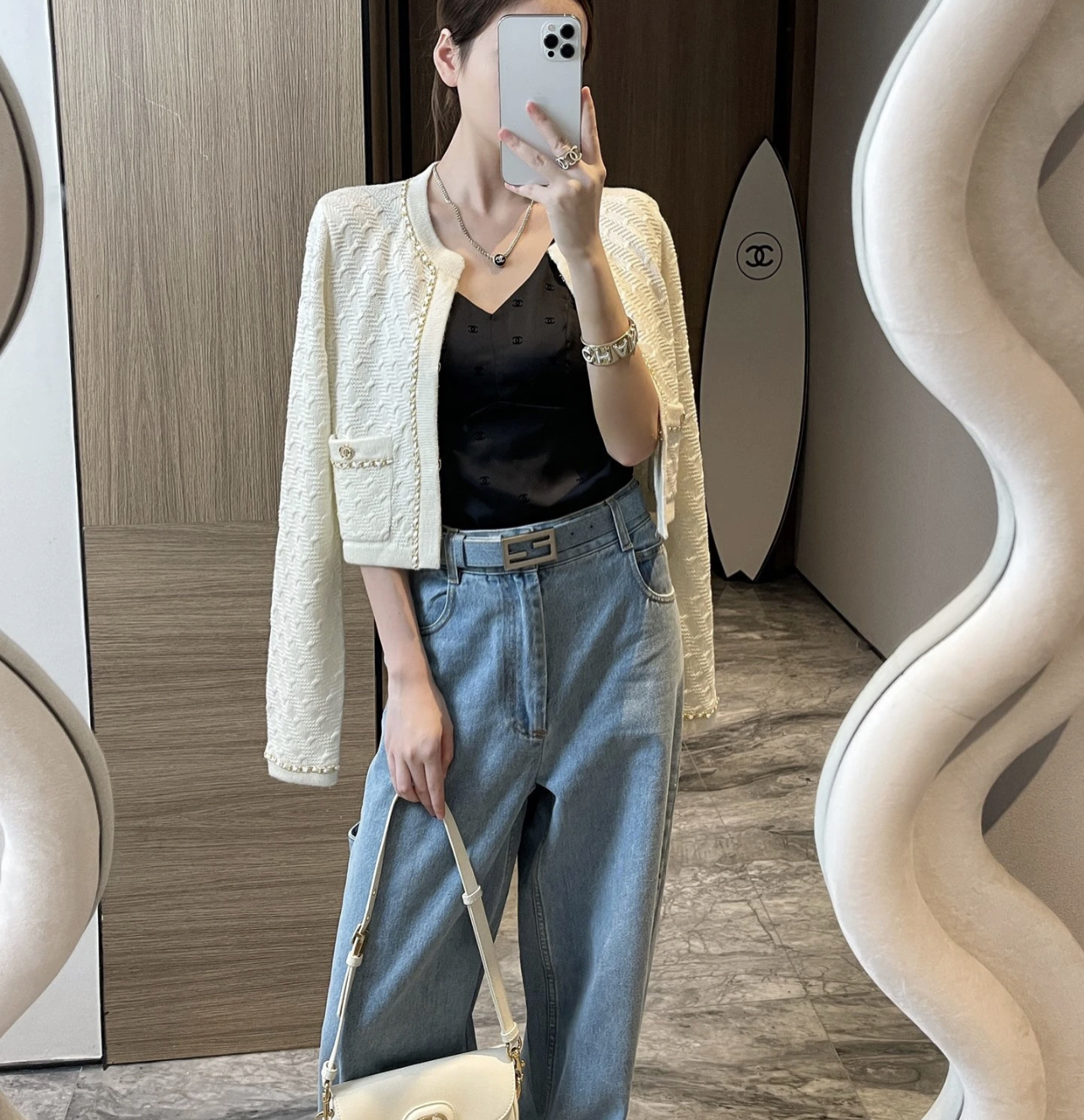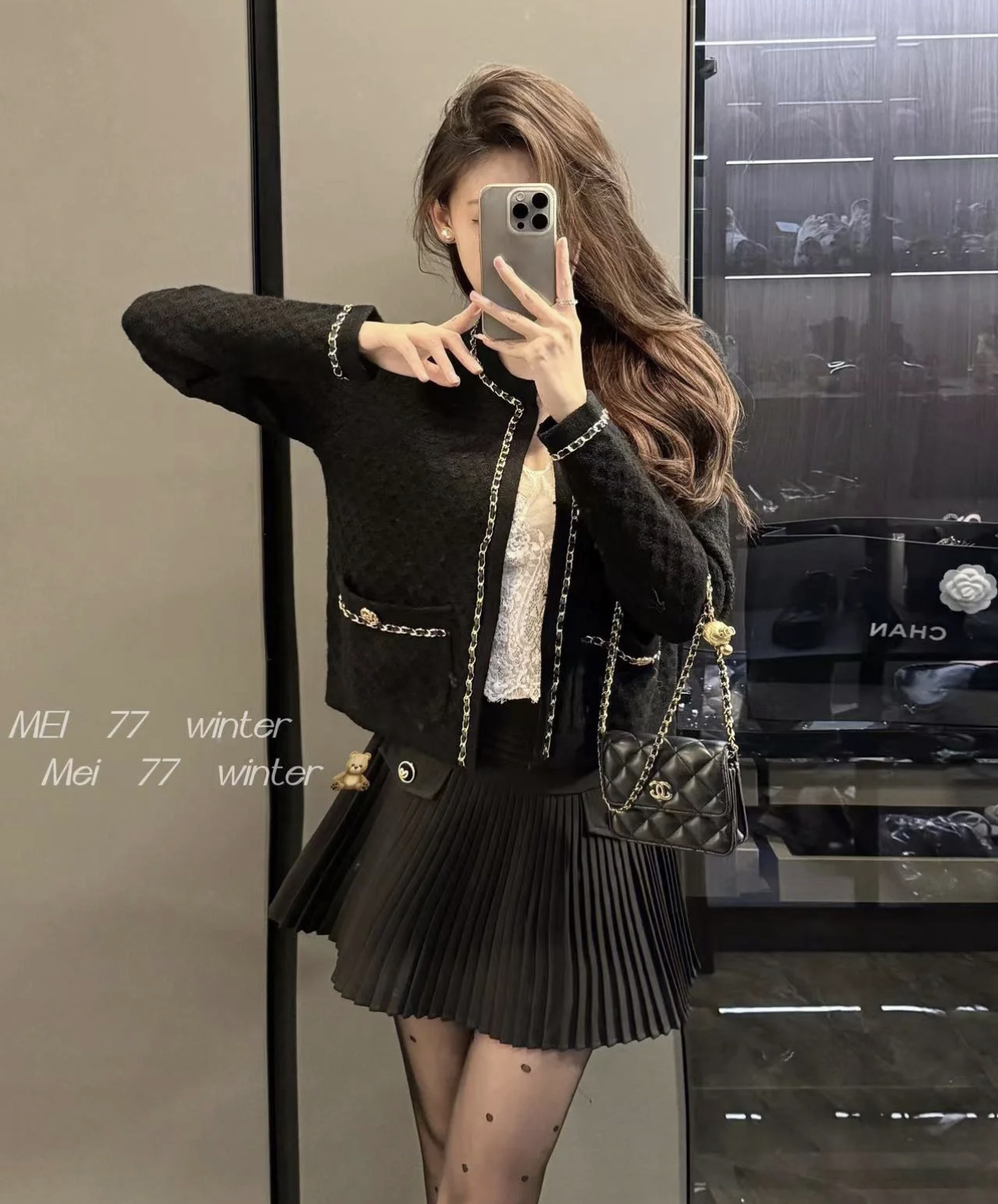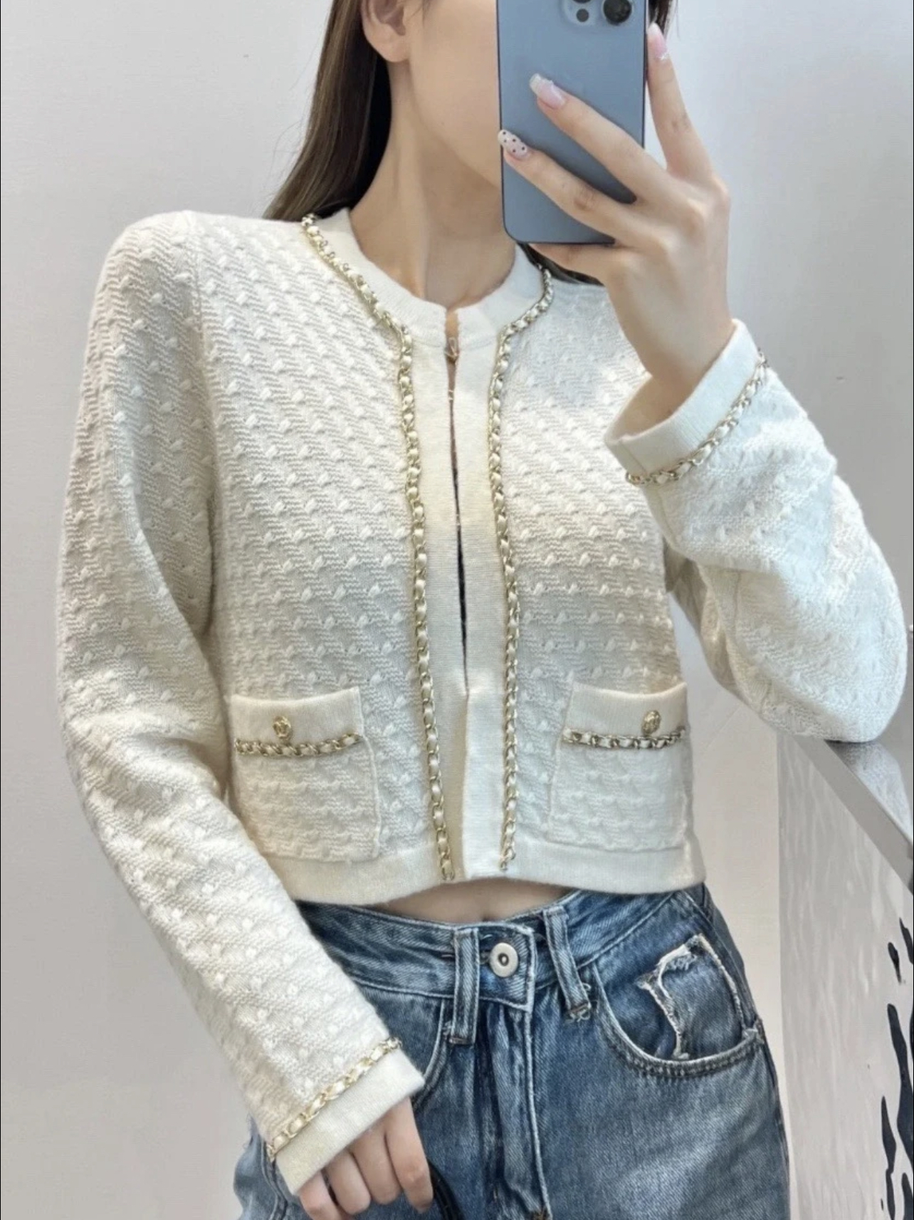 ✨ 🆕 ❤️ CH*NL Black gold leather chain knitted cardigan, soft and delicate, super comfortable to wear in autumn and winter! Classic black+gold chain, perfect for details #. Round neck design, with chain decorations on the cuffs and pockets, and dual C metal buckles that are highly recognizable. Dotted knit texture, loose fit, slim and versatile, easy to handle for commuting and gatherings, elegant temperament at your fingertips~ ☑️