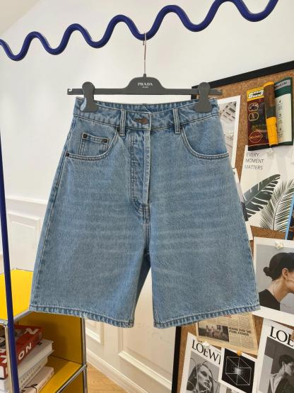 New cropped denim shorts; these contemporary high-waisted Bermuda shorts are bleached for a modern, casual look